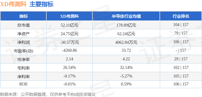 伟测科技2024年一季报显示,公司主营收入1.84亿元,同比上升30.99%;归母净利润-30.57万元,同比下降101.12%;扣非净利润-412.51万元,同比下降120.39%;负债率34.22%,投资收益87.65万元,财务费用627.21万元,毛利率26.54%。XD伟测科(688372)主营业务:晶圆测试、芯片成品测试以及与集成电路测试相关的配套服务。