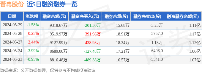 普冉股份融资融券信息显示,融资方面,当日融资买入389.75万元,融资偿还591.05万元,融资净偿还201.3万元。融券方面,融券卖出3948.0股,融券偿还3.62万股,融券余量15.68万股,融券余额1751.84万元。融资融券余额1.11亿元。近5日融资融券数据一览见下表: