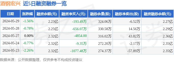 酒钢宏兴融资融券信息显示,融资方面,当日融资买入955.29万元,融资偿还1148.78万元,融资净偿还193.49万元。融券方面,融券卖出1600.0股,融券偿还6.68万股,融券余量324.06万股,融券余额408.32万元。融资融券余额2.27亿元。近5日融资融券数据一览见下表: