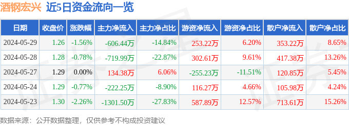 酒钢宏兴(600307)5月29日主力资金净卖出606.44万元