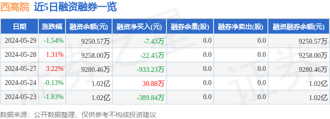西高院融资融券信息显示,融资方面,当日融资买入454.52万元,融资偿还461.95万元,融资净偿还7.43万元。融券方面,融券卖出0.0股,融券偿还0.0股,融券余量0.0股,融券余额0.0万元。融资融券余额9250.57万元。近5日融资融券数据一览见下表: