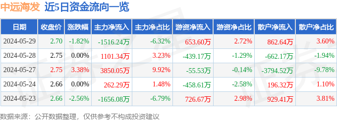 5月29日的资金流向数据方面,主力资金净流出1516.24万元,占总成交额6.32%,游资资金净流入653.6万元,占总成交额2.72%,散户资金净流入862.64万元,占总成交额3.6%。