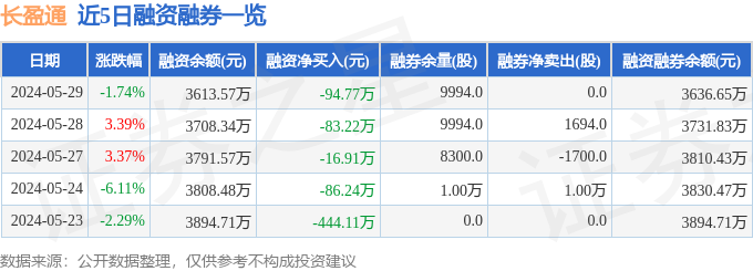 长盈通融资融券信息显示,融资方面,当日融资买入153.39万元,融资偿还248.16万元,融资净偿还94.77万元。融券方面,融券卖出0.0股,融券偿还0.0股,融券余量9994.0股,融券余额23.08万元。融资融券余额3636.65万元。近5日融资融券数据一览见下表: