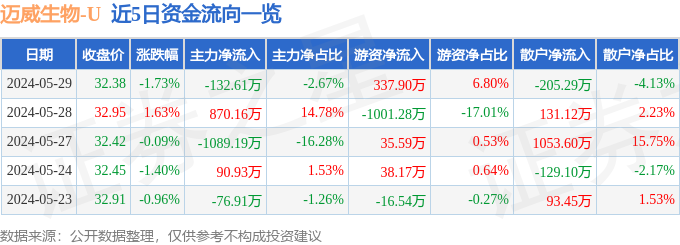 迈威生物(688062)5月29日主力资金净卖出132.61万元