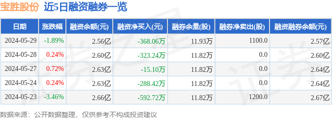 宝胜股份融资融券信息显示,融资方面,当日融资买入434.06万元,融资偿还802.12万元,融资净偿还368.06万元。融券方面,融券卖出1100.0股,融券偿还0.0股,融券余量11.93万股,融券余额49.51万元。融资融券余额2.57亿元。近5日融资融券数据一览见下表: