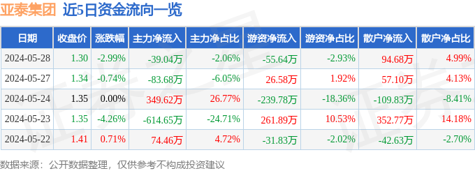 亚泰集团(600881)5月28日主力资金净卖出39.04万元