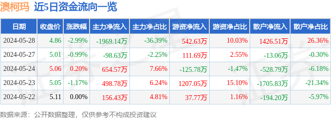 5月28日的资金流向数据方面,主力资金净流出1969.14万元,占总成交额36.39%,游资资金净流入542.63万元,占总成交额10.03%,散户资金净流入1426.51万元,占总成交额26.36%。