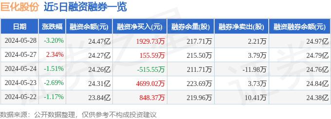 巨化股份融资融券信息显示,融资方面,当日融资买入9886.97万元,融资偿还7957.24万元,融资净买入1929.73万元。融券方面,融券卖出2.64万股,融券偿还4300.0股,融券余量217.71万股,融券余额5072.64万元。融资融券余额24.97亿元。近5日融资融券数据一览见下表: