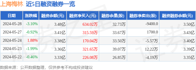 上海梅林融资融券信息显示,融资方面,当日融资买入1231.37万元,融资偿还597.34万元,融资净买入634.02万元,连续3日净买入累计1119.66万元。融券方面,融券卖出4200.0股,融券偿还1.36万股,融券余量32.73万股,融券余额204.89万元。融资融券余额3.5亿元。近5日融资融券数据一览见下表:
