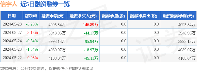 信宇人融资融券信息显示,融资方面,当日融资买入226.0万元,融资偿还79.11万元,融资净买入146.89万元。融券方面,融券卖出0.0股,融券偿还0.0股,融券余量0.0股,融券余额0.0万元。融资融券余额4095.84万元。近5日融资融券数据一览见下表: