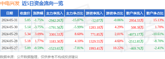 中电兴发(002298)5月31日主力资金净卖出2942.26万元