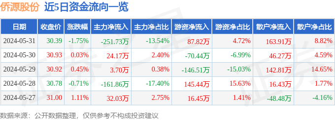 侨源股份(301286)5月31日主力资金净卖出251.73万元