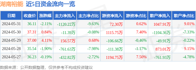 湖南裕能(301358)5月31日主力资金净卖出1120.22万元