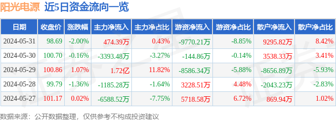 财经消息,截至2024年5月31日收盘,阳光电源(300274)报收于98.69元,下跌2.0%,换手率0.98%,成交量11.11万手,成交额11.04亿元。