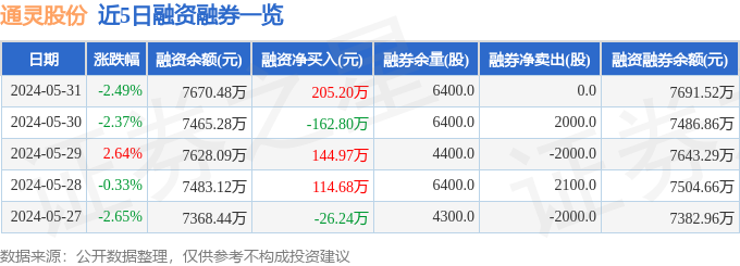 通灵股份融资融券信息显示,融资方面,当日融资买入933.82万元,融资偿还728.63万元,融资净买入205.2万元。融券方面,融券卖出0.0股,融券偿还0.0股,融券余量6400.0股,融券余额21.04万元。融资融券余额7691.52万元。近5日融资融券数据一览见下表: