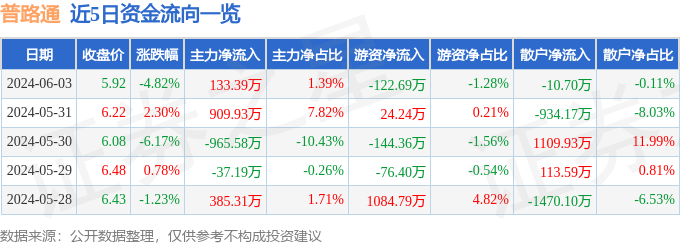 财经消息,截至2024年6月3日收盘,普路通(002769)报收于5.92元,下跌4.82%,换手率4.8%,成交量15.96万手,成交额9583.02万元。