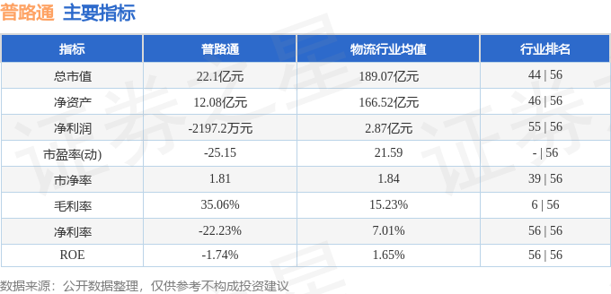 普路通2024年一季报显示,公司主营收入1.28亿元,同比下降14.95%;归母净利润-2197.2万元,同比下降83.88%;扣非净利润-2200.3万元,同比下降62.43%;负债率82.47%,投资收益318.7万元,财务费用6246.47万元,毛利率35.06%。普路通(002769)主营业务:供应链管理服务。