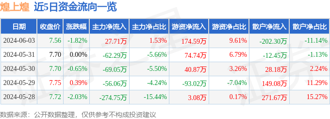 股票行情快报:煌上煌(002695)6月3日主力资金净买入27.71万元