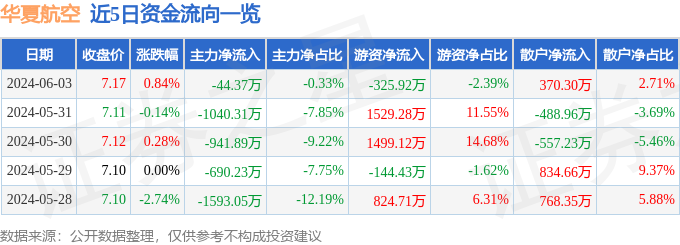 财经消息,截至2024年6月3日收盘,华夏航空(002928)报收于7.17元,上涨0.84%,换手率1.57%,成交量19.18万手,成交额1.36亿元。