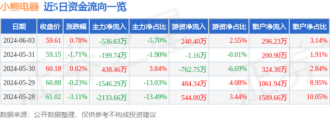 股票行情快报:小熊电器(002959)6月3日主力资金净卖出536.63万元