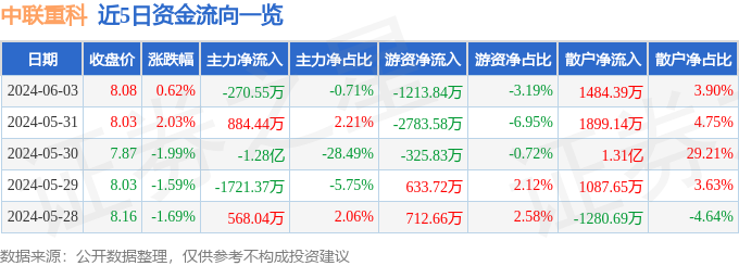 6月3日的资金流向数据方面,主力资金净流出270.55万元,占总成交额0.71%,游资资金净流出1213.84万元,占总成交额3.19%,散户资金净流入1484.39万元,占总成交额3.9%。