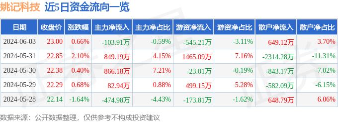 财经消息,截至2024年6月3日收盘,姚记科技(002605)报收于23.0元,上涨0.66%,换手率2.33%,成交量7.7万手,成交额1.75亿元。