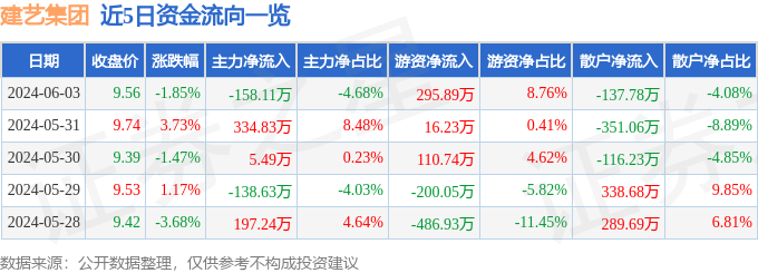股票行情快报:建艺集团(002789)6月3日主力资金净卖出158.11万元