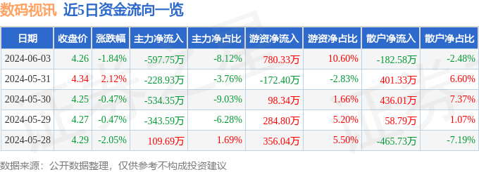 股票行情快报:数码视讯(300079)6月3日主力资金净卖出597.75万元