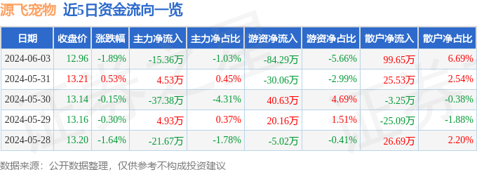 股票行情快报:源飞宠物(001222)6月3日主力资金净卖出15.36万元