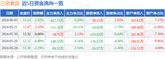 股票行情快报:三全食品(002216)6月3日主力资金净卖出417.73万元