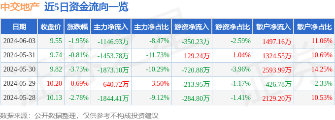 财经消息,截至2024年6月3日收盘,中交地产(000736)报收于9.55元,下跌1.95%,换手率2.04%,成交量14.15万手,成交额1.35亿元。
