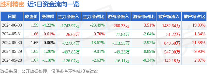 财经消息,截至2024年6月3日收盘,胜利精密(002426)报收于1.59元,下跌4.22%,换手率1.35%,成交量46.14万手,成交额7418.56万元。