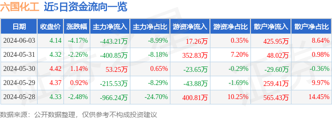 六国化工(600470)6月3日主力资金净卖出443.21万元