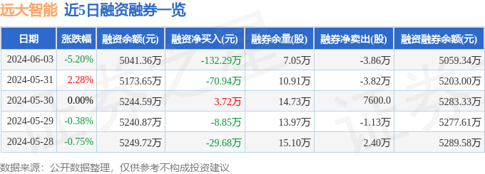远大智能融资融券信息显示,融资方面,当日融资买入71.41万元,融资偿还203.7万元,融资净偿还132.29万元。融券方面,融券卖出0.0股,融券偿还3.86万股,融券余量7.05万股,融券余额17.98万元。融资融券余额5059.34万元。近5日融资融券数据一览见下表: