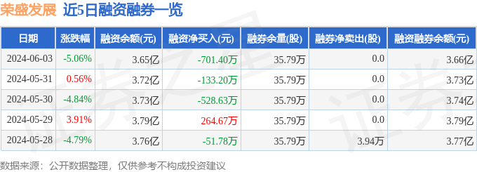 荣盛发展融资融券信息显示,融资方面,当日融资买入1657.76万元,融资偿还2359.17万元,融资净偿还701.4万元。融券方面,融券卖出0.0股,融券偿还0.0股,融券余量35.79万股,融券余额60.49万元。融资融券余额3.66亿元。近5日融资融券数据一览见下表: