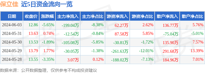 保立佳(301037)6月3日主力资金净卖出199.04万元