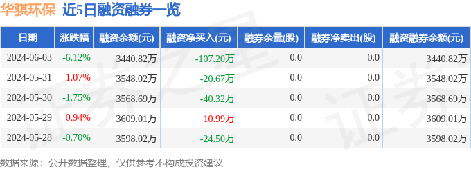 华骐环保融资融券信息显示,融资方面,当日融资买入52.93万元,融资偿还160.12万元,融资净偿还107.2万元。融券方面,融券卖出0.0股,融券偿还0.0股,融券余量0.0股,融券余额0.0万元。融资融券余额3440.82万元。近5日融资融券数据一览见下表: