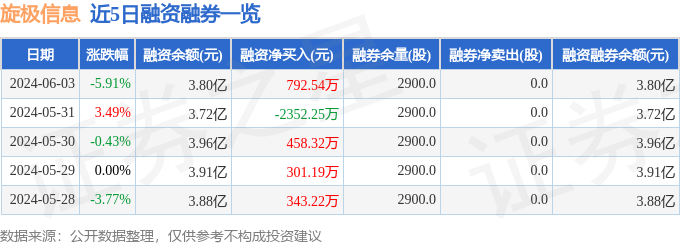 旋极信息融资融券信息显示,融资方面,当日融资买入1347.25万元,融资偿还554.71万元,融资净买入792.54万元。融券方面,融券卖出0.0股,融券偿还0.0股,融券余量2900.0股,融券余额0.65万元。融资融券余额3.8亿元。近5日融资融券数据一览见下表: