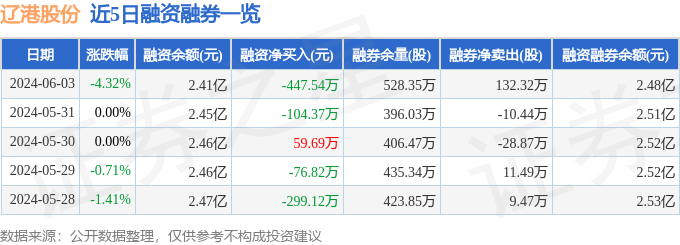 辽港股份融资融券信息显示,融资方面,当日融资买入1838.21万元,融资偿还2285.75万元,融资净偿还447.54万元。融券方面,融券卖出187.95万股,融券偿还55.63万股,融券余量528.35万股,融券余额702.71万元。融资融券余额2.48亿元。近5日融资融券数据一览见下表: