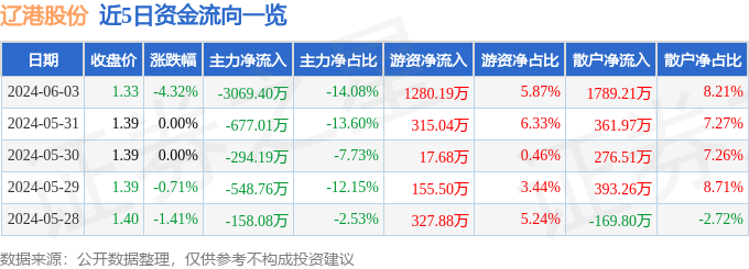 财经消息,截至2024年6月3日收盘,辽港股份(601880)报收于1.33元,下跌4.32%,换手率0.86%,成交量161.7万手,成交额2.18亿元。