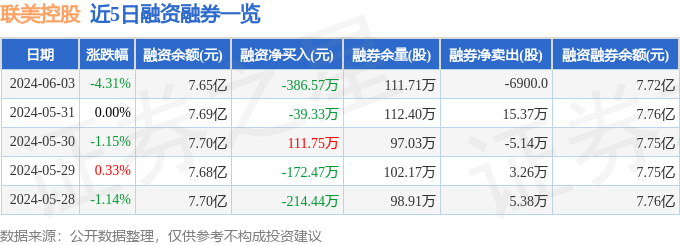 联美控股融资融券信息显示,融资方面,当日融资买入1488.88万元,融资偿还1875.45万元,融资净偿还386.57万元。融券方面,融券卖出10.33万股,融券偿还11.02万股,融券余量111.71万股,融券余额644.57万元。融资融券余额7.72亿元。近5日融资融券数据一览见下表:
