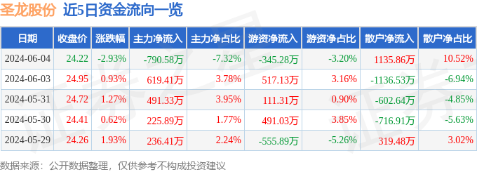 股票行情快报:圣龙股份(603178)6月4日主力资金净卖出790.58万元