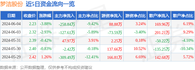 6月4日的资金流向数据方面,主力资金净流出258.84万元,占总成交额9.42%,游资资金净流入88.88万元,占总成交额3.24%,散户资金净流入169.96万元,占总成交额6.19%。