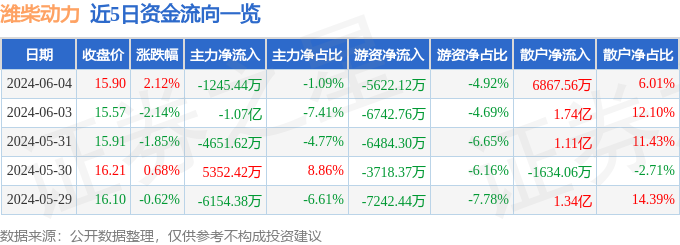 财经消息,截至2024年6月4日收盘,潍柴动力(000338)报收于15.9元,上涨2.12%,换手率1.46%,成交量72.66万手,成交额11.43亿元。