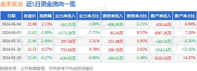 6月4日的资金流向数据方面,主力资金净流出161.35万元,占总成交额1.69%,游资资金净流出498.09万元,占总成交额5.21%,散户资金净流入659.44万元,占总成交额6.9%。