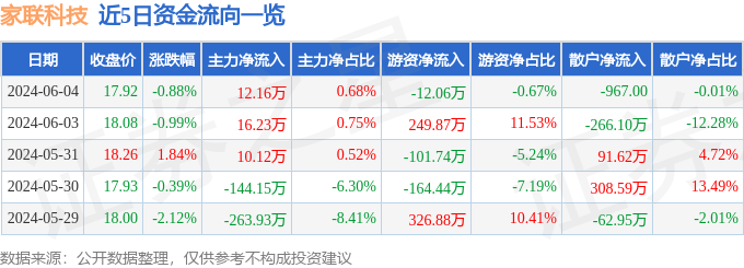 股票行情快报:家联科技(301193)6月4日主力资金净买入12.16万元