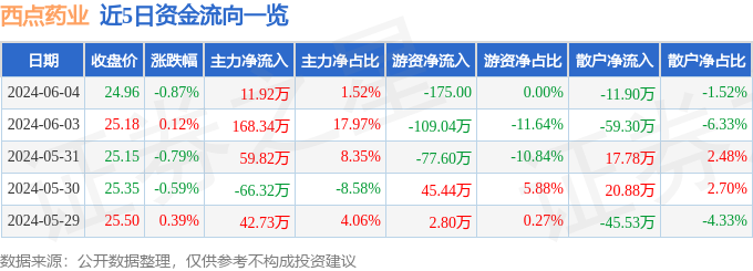 财经消息,截至2024年6月4日收盘,西点药业(301130)报收于24.96元,下跌0.87%,换手率0.54%,成交量3136.0手,成交额784.19万元。