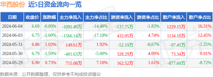 股票行情快报:华西股份(000936)6月4日主力资金净卖出1091.40万元
