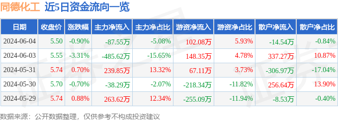 股票行情快报:同德化工(002360)6月4日主力资金净卖出87.55万元