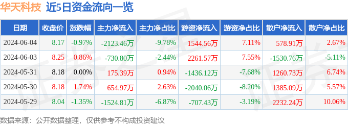 6月4日的资金流向数据方面,主力资金净流出2123.46万元,占总成交额9.78%,游资资金净流入1544.56万元,占总成交额7.11%,散户资金净流入578.91万元,占总成交额2.67%。